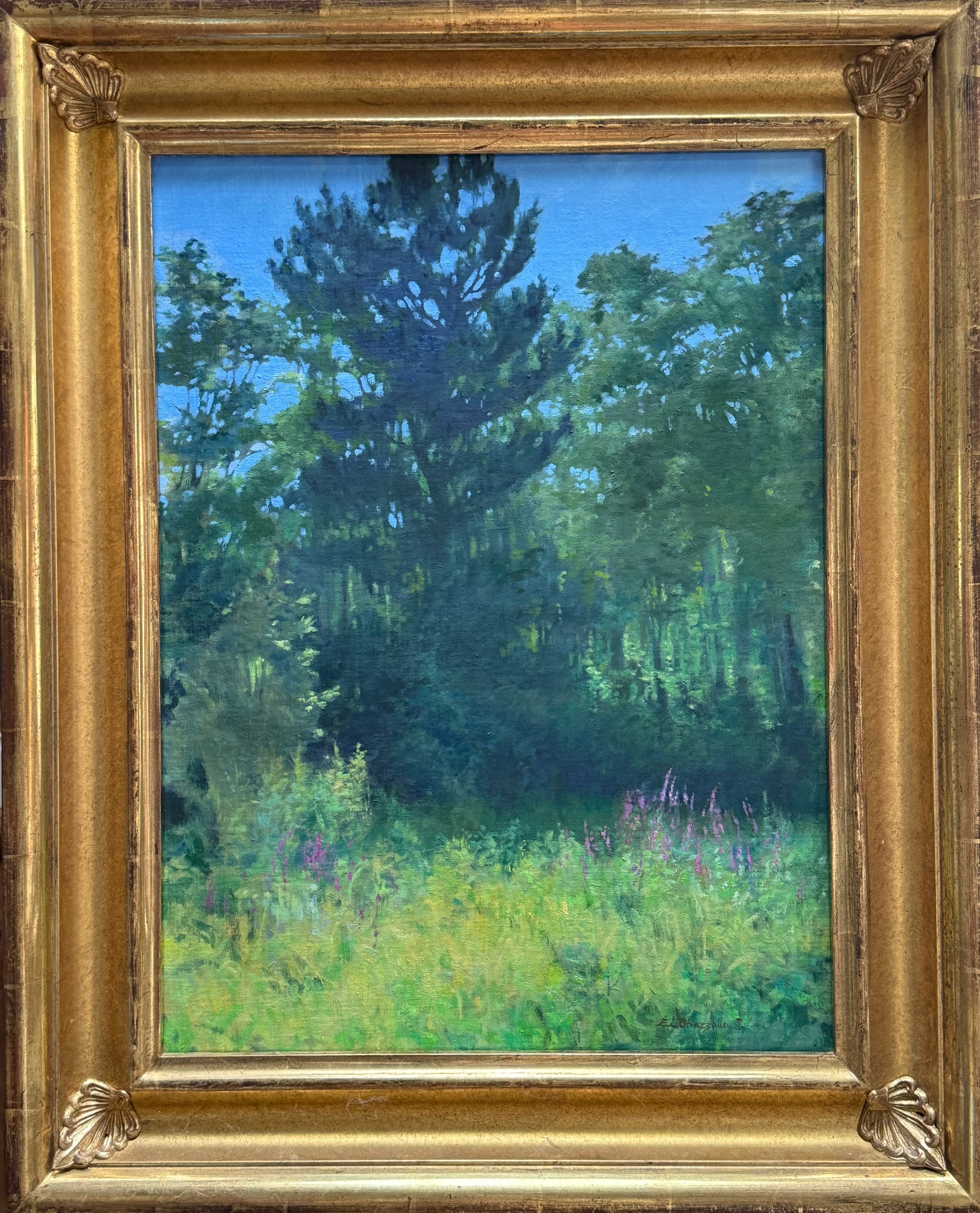 The August sun, shimmering from behind the trees, threw the pine into deep shadow while filling the meadow with stunning light. All around my easel the long grasses and wildflowers whispered with the soft sounds of summer.